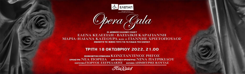 Οι διεθνείς Έλληνες σολίστ, που έχουν διαγράψει λαμπρή καριέρα στην Ελλάδα και το εξωτερικό, ενώνουν τις φωνές τους με αυτές των Γενναίων Παιδιών της ΕΛΕΠΑΠ, στηρίζοντας έμπρακτα τον καθημερινό τους αγώνα για ένα καλύτερο μέλλον, σε ένα μοναδικό Opera Gala στο Θέατρο Παλλάς, στις 18 Οκτωβρίου 2022 και ώρα 21:00.