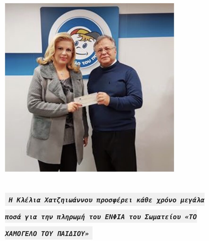 Είναι γνωστό ότι επί 6 συνεχόμενα χρόνια η Κλέλια Χατζηιωάννου έχει δώσει σημαντικά ποσά για να εξοφλήσει τον ΕΝΦΙΑ του «Χαμόγελου του Παιδιού», διπλασιάζοντας επιπρόσθετα πρόπερσι το ποσό που θα συγκεντρωνόταν στον τηλεμαραθώνιο υπέρ του Ιδρύματος!