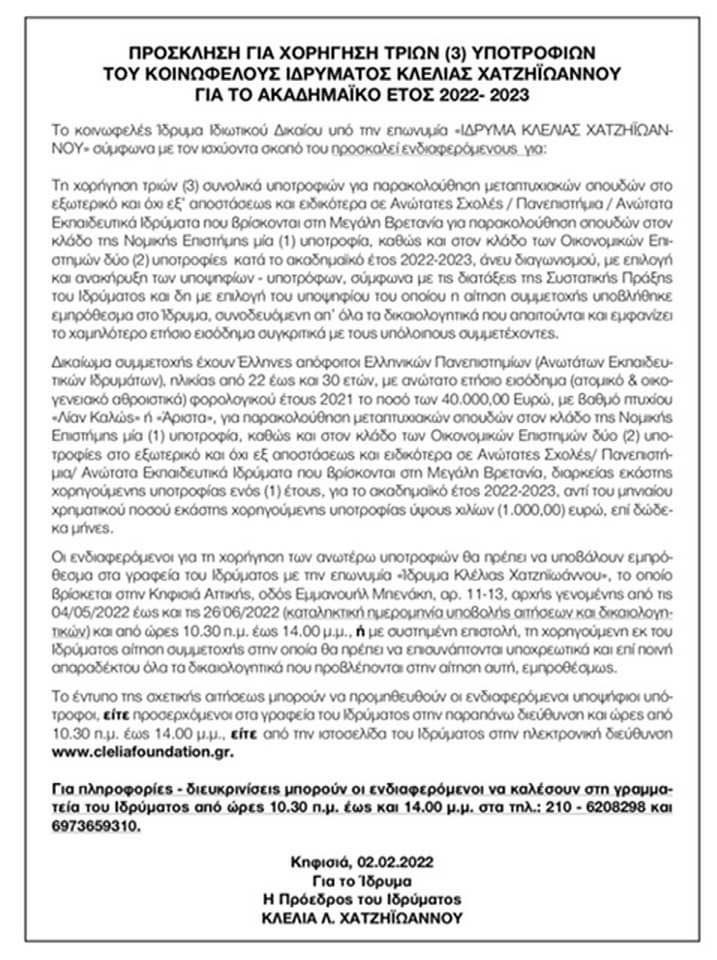 Συγκεκριμένα η εφημερίδα «Νέα» δημοσίευσε πρόσφατα για 7η συνεχή χρονιά πρόσκληση για χορήγηση 3 υποτροφιών από το Ίδρυμα Κλελια Χατζηϊωάννου για το Ακαδημαϊκό έτος 2021-2022, που αφορούν μεταπτυχιακές σπουδές στην Αγγλία!