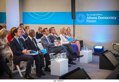 Με κάθε επισημότητα και με υψηλούς προσκεκλημένους ξεκίνησε χθες στο Προεδρικό Μέγαρο το 5ο New York Times Athens Democracy Forum και θα διαρκέσει μέχρι τις 17 Σεπτεμβρίου. Η σημαντική αυτή ετήσια συνάντηση οργανώνεται από τους The New York Times, σε συνεργασία με το Ταμείο για τη Δημοκρατία του Οργανισμού Ηνωμένων Εθνών, τον Δήμο Αθηναίων, την εφημερίδα «Η Καθημερινή» και έχει την υποστήριξη του Γενικού Γραμματέα του Οργανισμού Ηνωμένων Εθνών, Αντόνιο Γκουτιέρες. Την έναρξη των εργασιών κήρυξαν ο πρόεδρος της Ελληνικής Δημοκρατίας Προκόπης Παυλόπουλος και ο πρώην γενικός γραμματέας του ΟΗΕ Κόφι Ανάν, σε μια λαμπρή τελετή παρουσία πολιτικών και εκπροσώπων του επιχειρηματικού κόσμου.